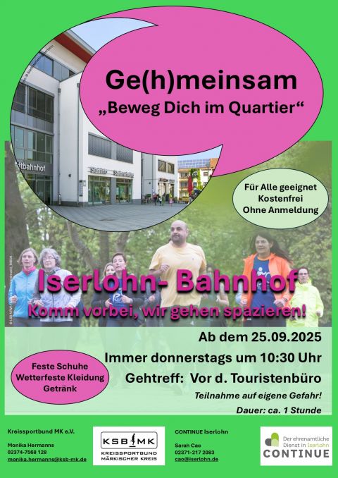 Bewegung verbindet und hält Geist und Seele fit. Genau das ist auch die Idee hinter dem neuen Projekt "Ge(h)meinsam - Beweg dich im Quartier". Spazierfreudige treffen sich an vier verschiedenen Treffpunkten in Iserlohn, um gemeinsam eine schöne Runde zu drehen. Dabei gibt es die Gelegenheit, neue Menschen kennenzulernen, sich ganz entspannt zu unterhalten und gemeinsam eine gute Zeit zu haben.