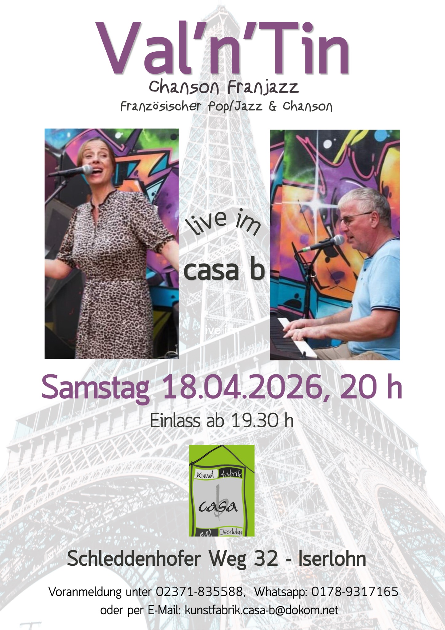 Chanson Franjazz nennt das Duo Val`n`Tin seinen Stil, der sich überwiegend aus französischem Pop, Jazz und Chansons zusammensetzt. Sängerin Valerie Jammes und Pianist Martin Weyer-von Schoultz interpretieren bekannte Songs u.a. von ZAZ, Stromae, Charles Trenet, Michel Legrand, France Gall, Patricia Kaas... auf ihre eigene Weise und erzählen dazu Anekdoten über die Begegnung von Mensch(en) und Kultur(en) dies- und jenseits der deutsch-französischen Grenzen.