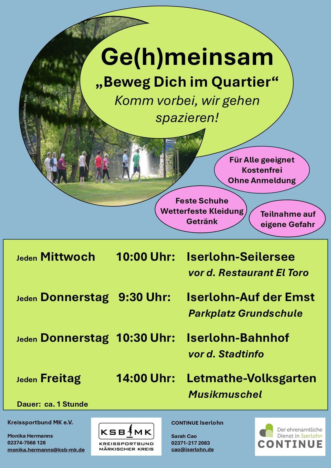 Bewegung verbindet und hält Geist und Seele fit. Genau das ist auch die Idee hinter dem neuen Projekt "Ge(h)meinsam - Beweg dich im Quartier". Spazierfreudige treffen sich an vier verschiedenen Treffpunkten in Iserlohn, um gemeinsam eine schöne Runde zu drehen. Dabei gibt es die Gelegenheit, neue Menschen kennenzulernen, sich ganz entspannt zu unterhalten und gemeinsam eine gute Zeit zu haben.