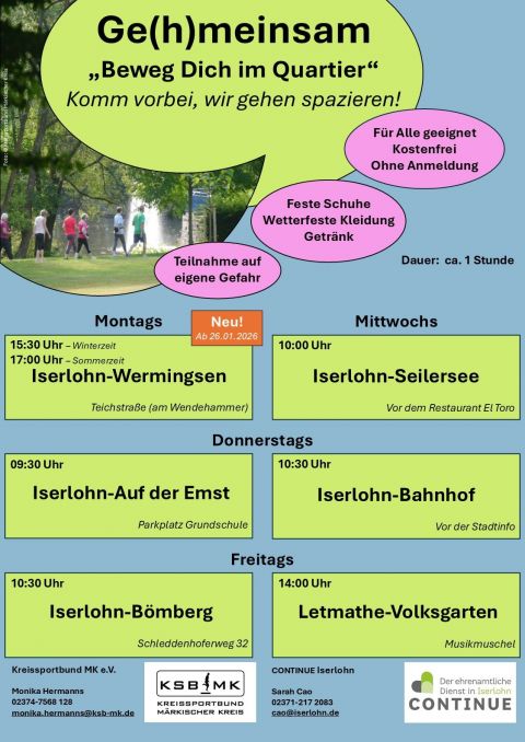 Bewegung verbindet und hält Geist und Seele fit. Genau das ist auch die Idee hinter dem neuen Projekt "Ge(h)meinsam - Beweg dich im Quartier". Spazierfreudige treffen sich an sechs verschiedenen Treffpunkten in Iserlohn, um gemeinsam eine schöne Runde zu drehen. Dabei gibt es die Gelegenheit, neue Menschen kennenzulernen, sich ganz entspannt zu unterhalten und gemeinsam eine gute Zeit zu haben.