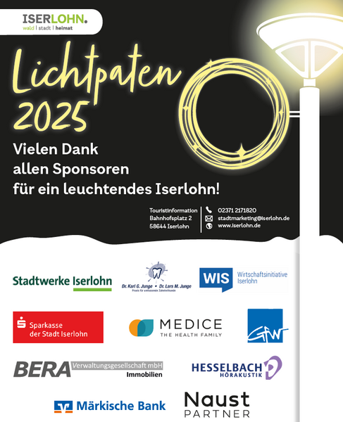 Für die diesjährige Weihnachtsbeleuchtung in der Iserlohner Innenstadt konnten wieder wie in den vergangenen Jahren „Lichtpaten“ gefunden werden. Das Stadtmarketing freut sich im siebten Jahr dieser Initiative über das finanzielle Engagement von 11 Sponsorinnen und Sponsoren, die mit der öffentlichen Kommunikation ihres Namens auch ein Stück Solidarität zu ihrer "Wald I Stadt I Heimat - Iserlohn" ausdrücken wollen.