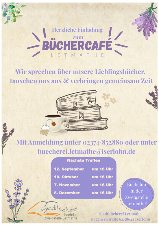 Bücherei Letmathe, 02374 85288-0 oder buecherei.letmathe(at)iserlohn.de