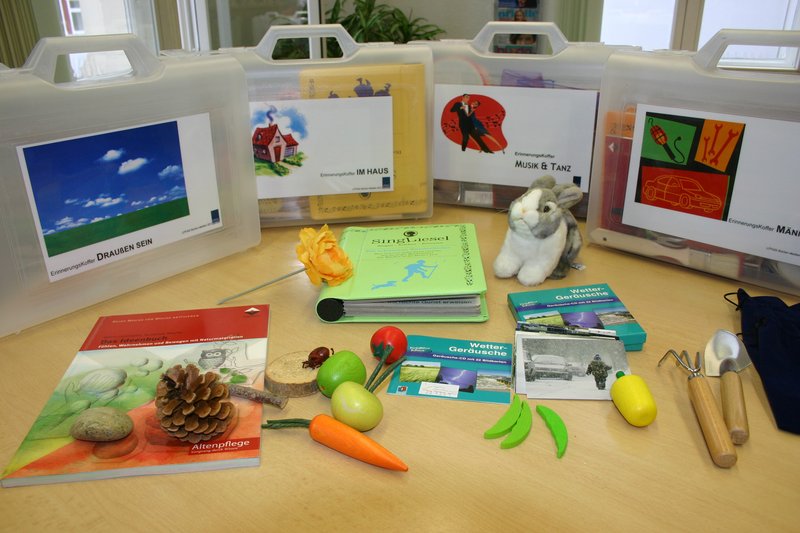 Die Erinnerungskoffer mit ihren verschiedenen Themenwelten regen zu Gesprächen an und eignen sich als Gedächtnistraining für Einzelne und in der Gruppe. Sie enthalten Ideen- und Liederbücher, CDs und viele Alltagsgegenstände zum Anschauen und Anfassen, so dass auch Menschen mit Demenz angeregt und aktiviert werden – immer passend zum Thema.