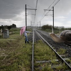 Other Worlds, treffender könnte ein Ausstellungstitel wohl kaum sein. Denn es sind wahrhaftig andere Welten, in die Alastair Magnaldo, gebürtiger Brite mit Wohnsitz in Frankreich, den Betrachter entführt. Seine fotografischen Arbeiten als Kollagen zu bezeichnen, käme einer groben Simplifizierung gleich. Es sind vielmehr kohärente Kompositionen aus Landschaftsbildern, die so meisterhaft mit anderen, überraschenden Elementen verwoben sind, dass die Werke zugleich abstrakt und doch auch verwirrend real erscheinen. Märchenwelten, wie den Phantasien eines Kindes entsprungen, Mögliches und Unmögliches als plausible Symbiose.