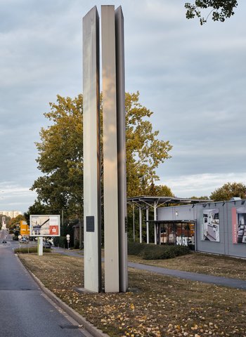 Der von der Stadt herkommende Betrachter glaubt sich zwei schlanken, durch eine schmale Linie getrennten Türmen zu nähern. Die breiten Wände der äußeren Wände betonen das Voluminöse, die scharfe Kante des mittleren Elements und die Schattenwirkungen der Zwischenräume das Aufstrebende der strengen Kontur. Dreiteilig präsentiert sich die der Stadt abgewandte Seite: in der Mitte eine hochrechteckige Fläche, rechts und links davon die schräg nach hinten fliehenden langen Seiten der äußeren Dreieckselemente. Die einzelnen Teile stehen - je nach Ansichtsseite - in einem Spannungsverhältnis zueinander, wobei das blockhaft Geschlossene auf das Lineare und Offene, die spitze auf die stumpfe Form stoßen. Unterschiedliche Seherfahrungen werden möglich. Der Raum zwischen den Dreieckselementen wird wesentlicher Teil der Skulptur.