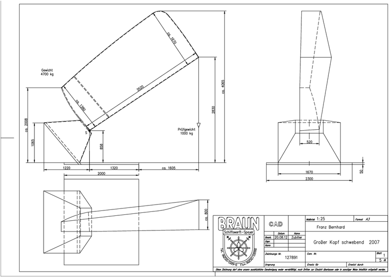 Die Plastik besteht aus einem pyramidalen Sockelstück, das den mächtigen Kopf trägt. Der fragil wirkende Aufbau ist exakt ausbalanciert und erzeugt trotz des massiven Raumkörpers den Eindruck großer Leichtigkeit. Die gebrochene Symmetrie und leichte Drehung erzeugen dabei eine zusätzliche Spannung und Dynamik. Die Kontrastkopplung aus rudimentärer Form, statischer Erscheinung, Veränderlichkeit und Unabgeschlossenheit stellt das wesentliche Qualitätskriterium im bildhauerischen Schaffen Franz Bernhards dar - im übertragenen Sinn ein Spiegel menschlicher Existenz.