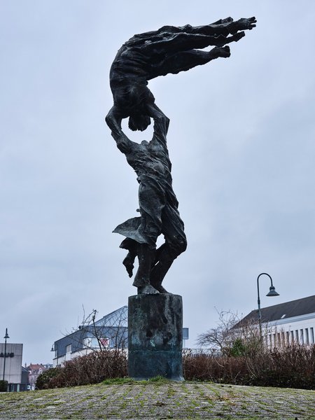 Obwohl sich die beiden vertikal orientierten, „aufgetürmten“ menschlichen Figuren weit über die Augenhöhe des Betrachters erheben, wirken sie in keiner Weise monumentalisierend: Ein junger Mann tanzt barfüßig auf dem zylindrischen Skulpturensockel. Er trägt einfache Sandalen zu einer zerschlissenen Hose.