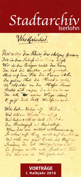 Im fünften Jahr in Folge legt das Stadtarchiv Iserlohn ein neues Vortragsprogramm vor. Auf Flyer und Plakat ist ein Ausschnitt aus der Originalhandschrift des „Westfalenliedes“ von Emil Rittershaus zu sehen.