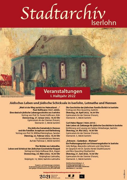 Die stadtgeschichtliche Veranstaltungsreihe von Stadtarchiv und Stadtmuseum widmet sich im I. Halbjahr 2022 dem Thema „Jüdisches Leben und jüdische Schicksale in Iserlohn, Letmathe und Hennen“. Kooperationspartner ist neben der VHS Iserlohn der Verein 321–2021: 1700 Jahre jüdisches Leben in Deutschland e.V.