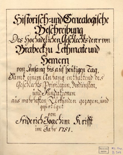 Handschrift "Historisch-Genealogische Beschreibung des hochadeligen Geschlechts derer von Brabeck zu Letmathe und Hemern (...), verfasst von Friedrich Joachim Krisst im Jahr 1751